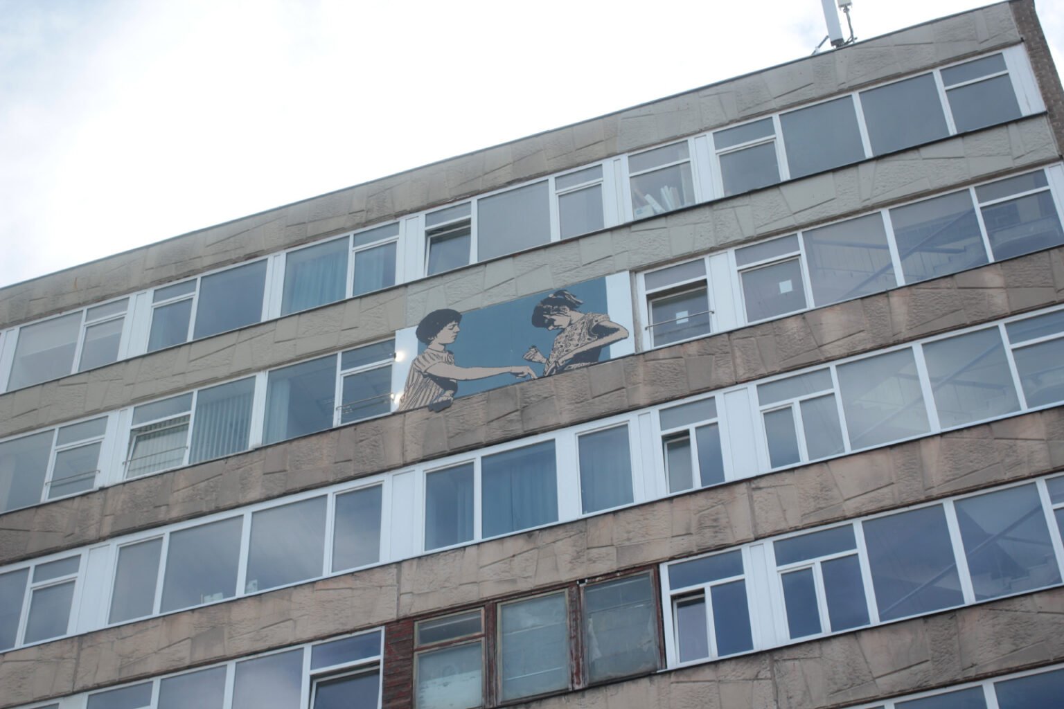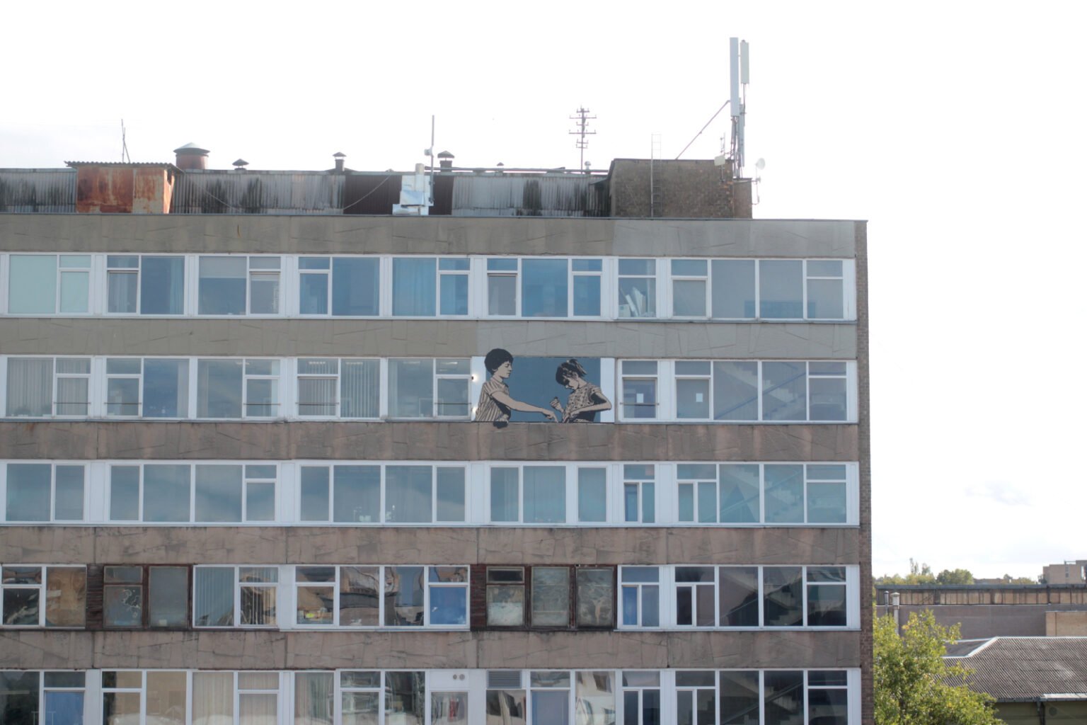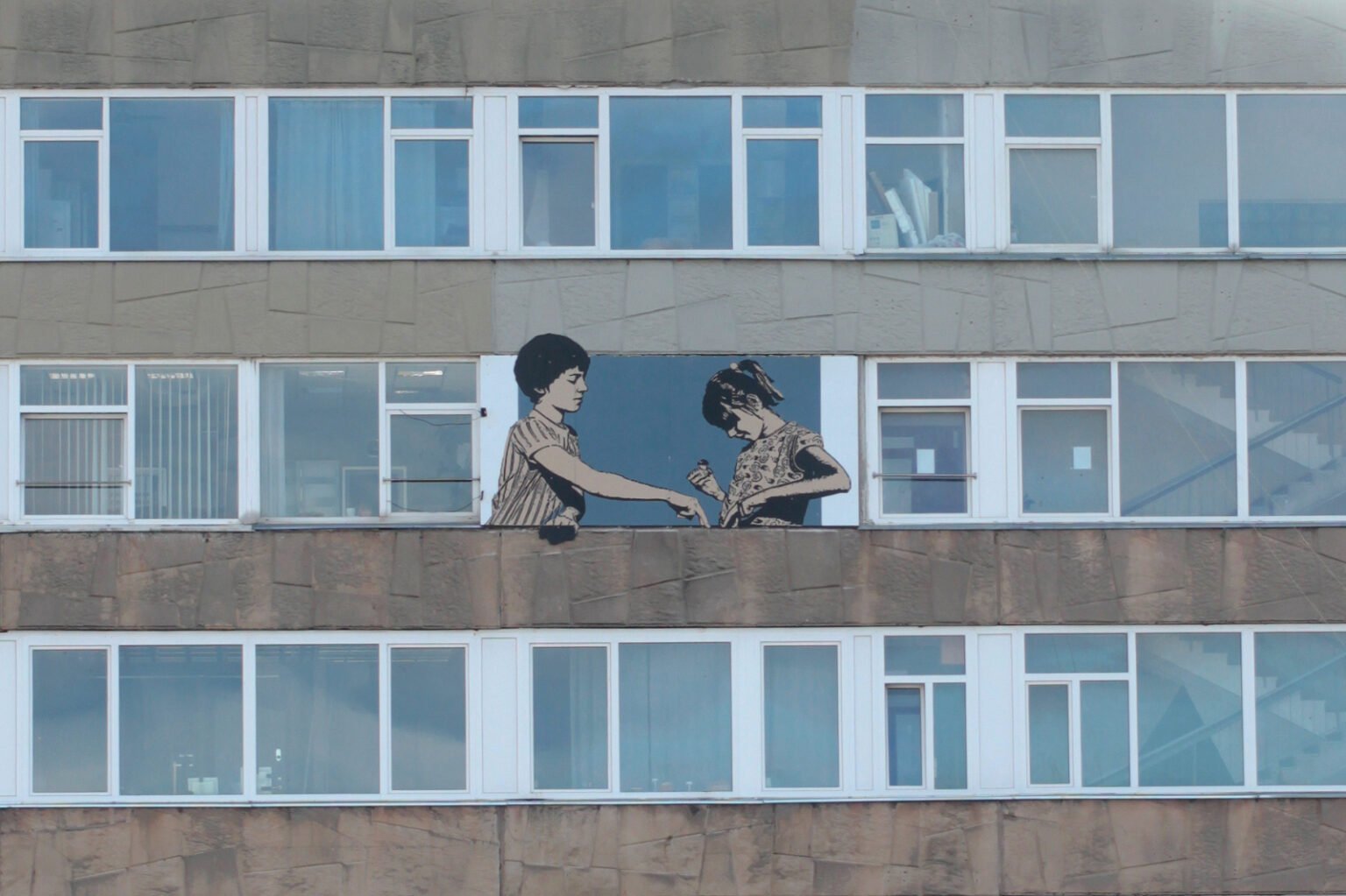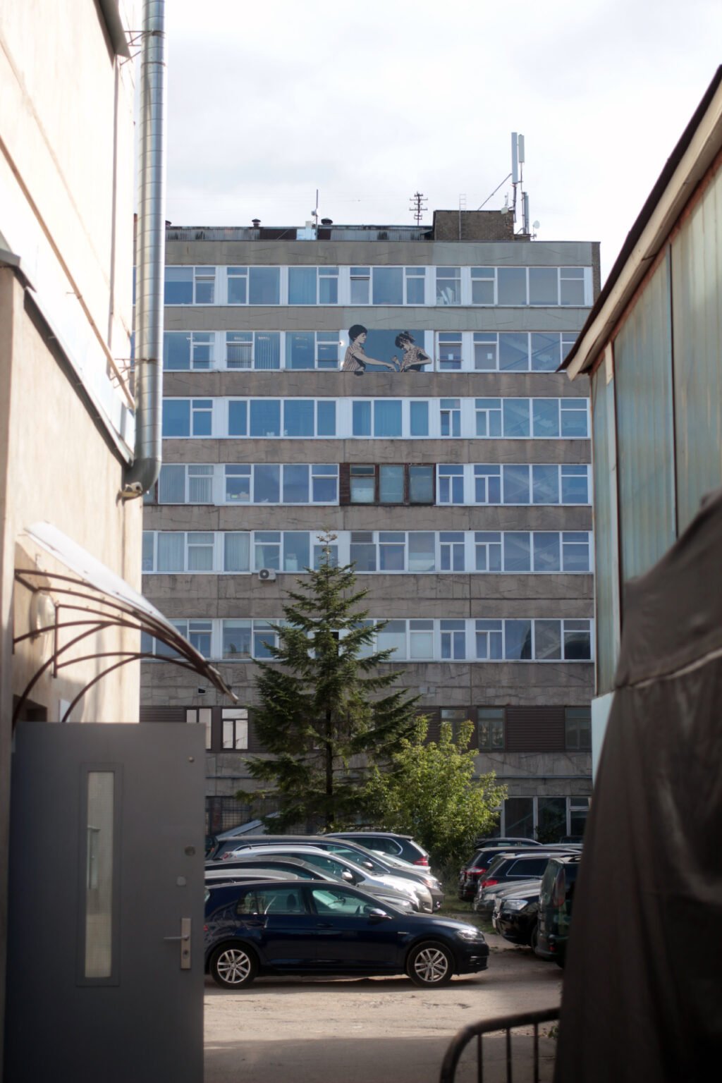 After several sketches, we decided that an image from the Lithuanian film “Balkonas” (“The Balcony,” directed by Giedrė Beinoriūtė) would fit perfectly. The figures of a boy and a girl transformed the sealed window into a kind of balcony — a poetic gesture turning a closed space into one that opens outward.