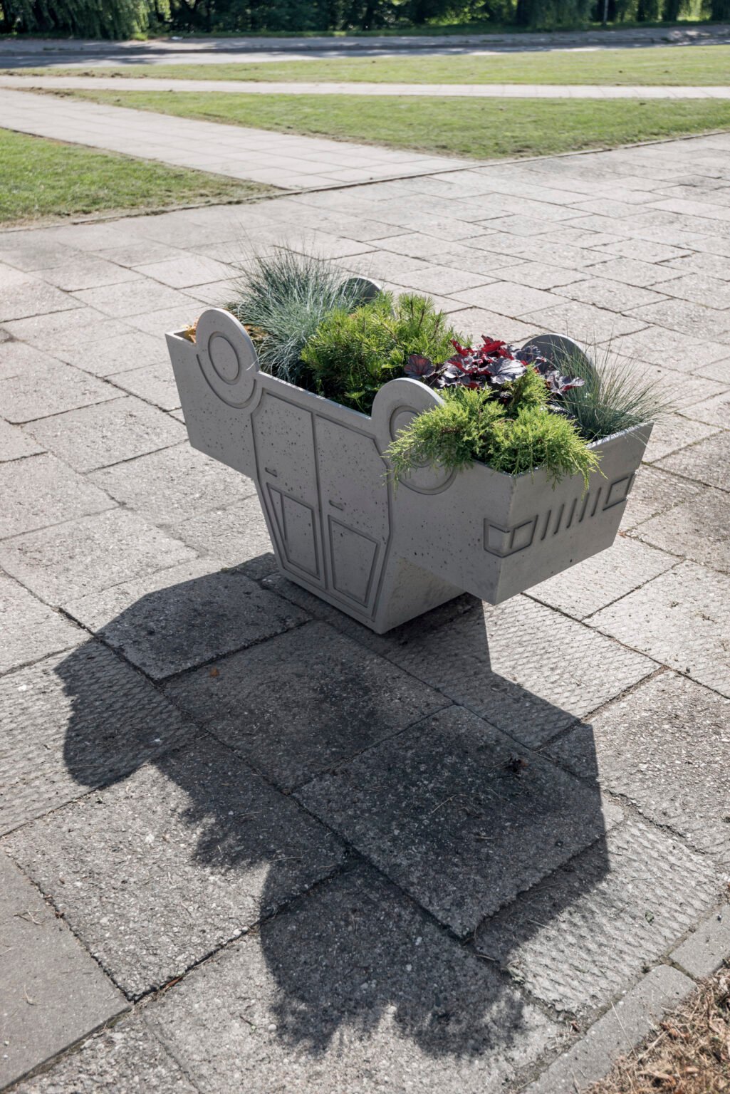 This urban design object was created from cement mixed with fine decorative gravel. Intended primarily as a functional barrier to restrict car access, it also serves as a planter — its interior filled with soil and planted with flowers or small shrubs. Not any new invention.
