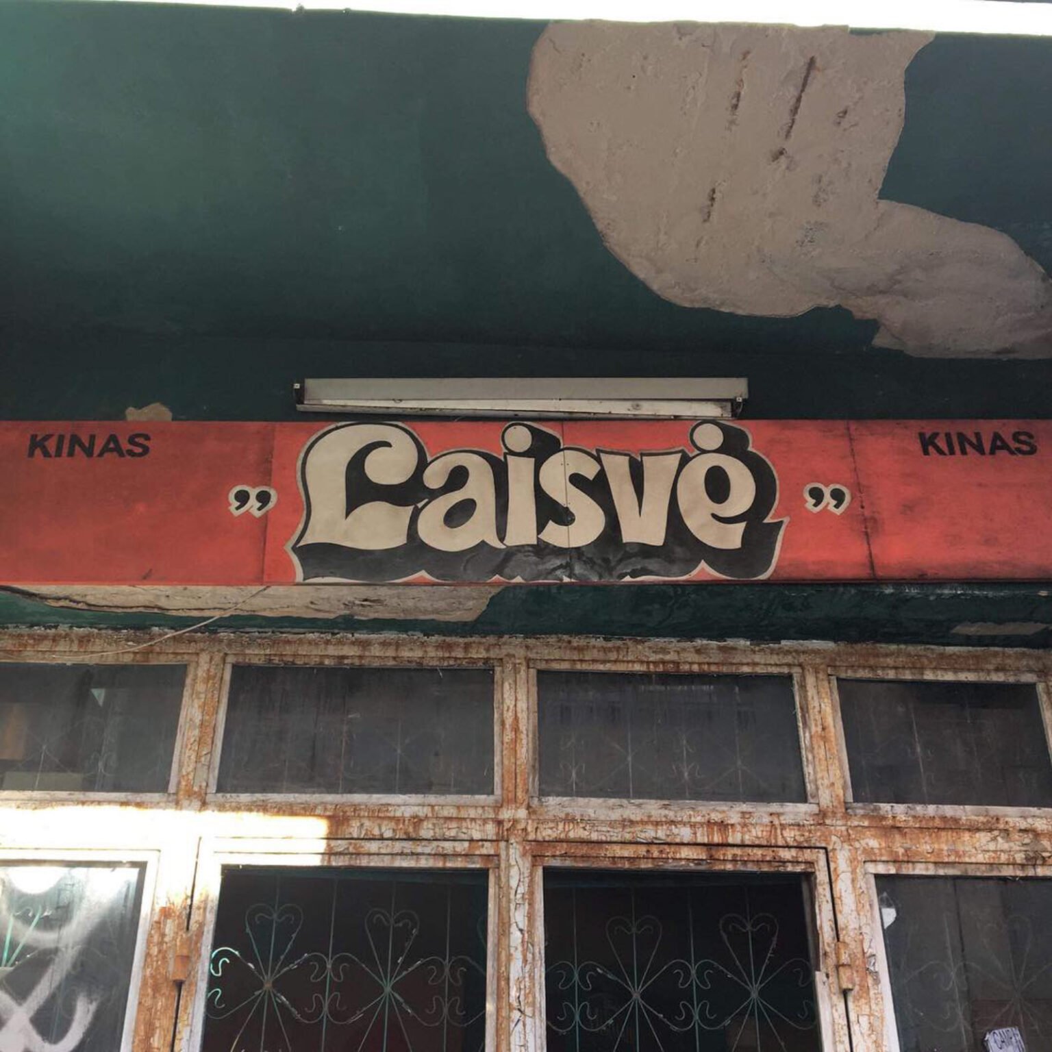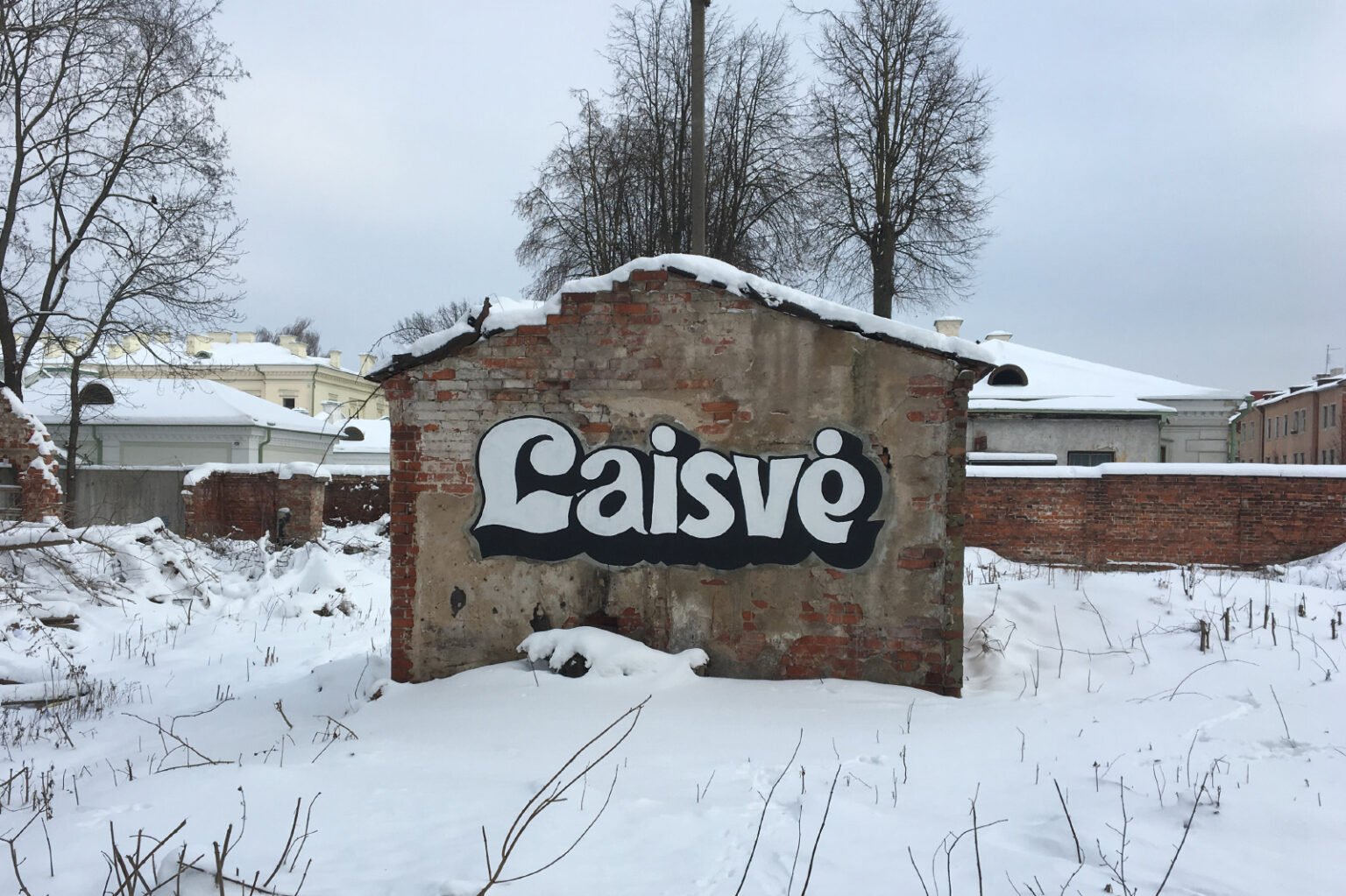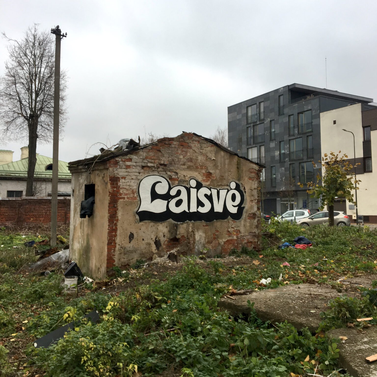 The word Laisvė (“Freedom”) was transplanted from the now-defunct Laisvės cinema logo onto an abandoned, derelict building on Miško Street in Kaunas. Its bold, graffiti-like lettering immediately caught my attention. I saw it as a universal symbol — a single word carrying meaning for everyone — and chose to place it in a completely new context.