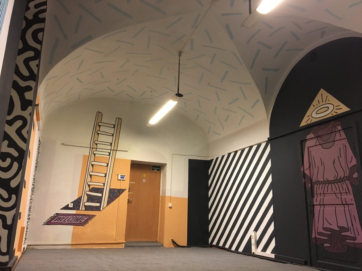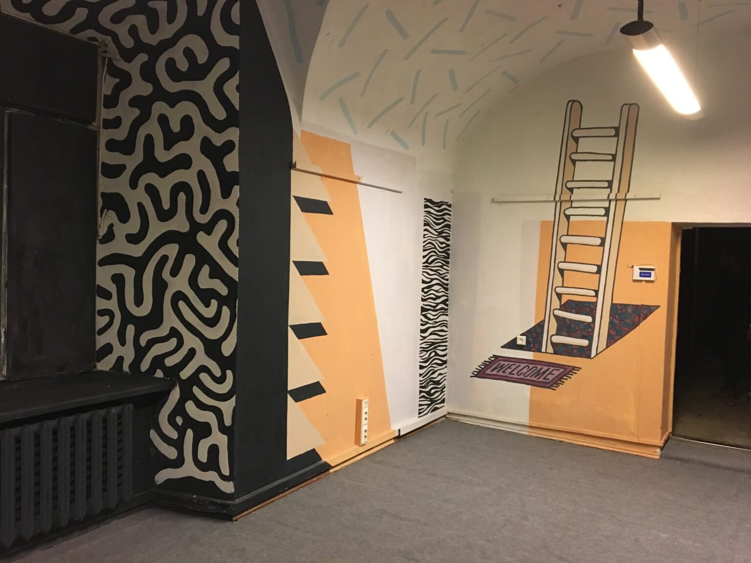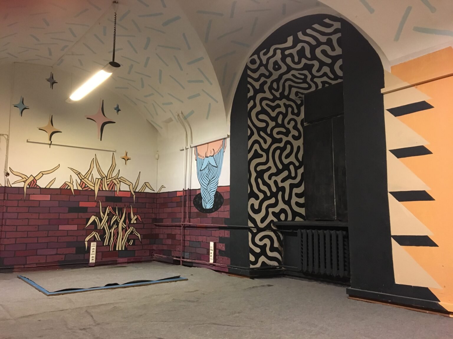This interior decor project was created inside an old monastery for my friend Adomas, who invited me to paint his band’s rehearsal studio — the space where they play and create music. It’s a spontaneous composition, blending textures, symbols, and a mix of random visual elements.