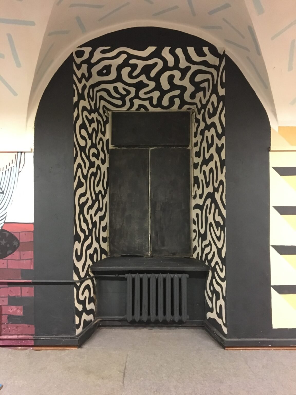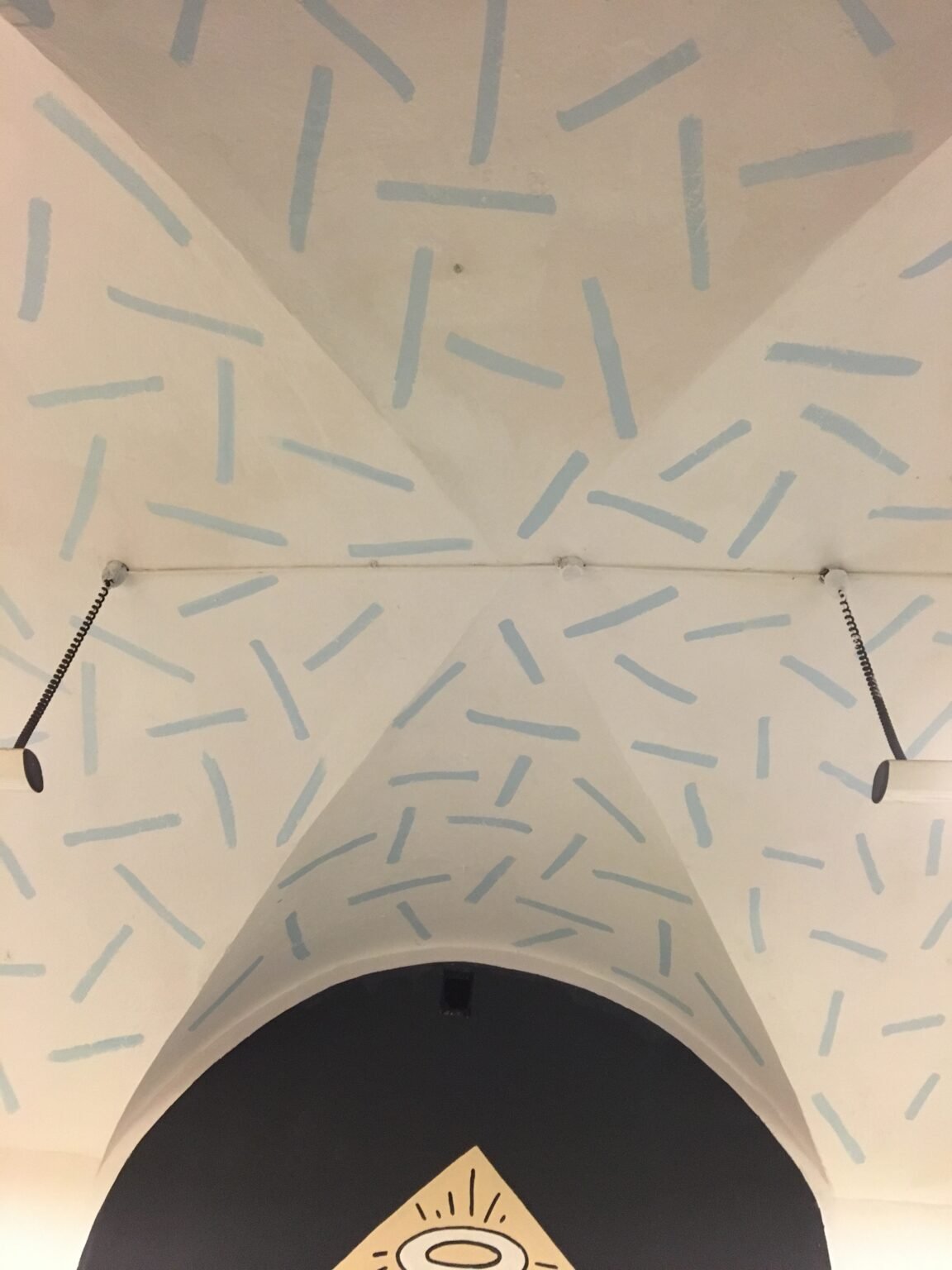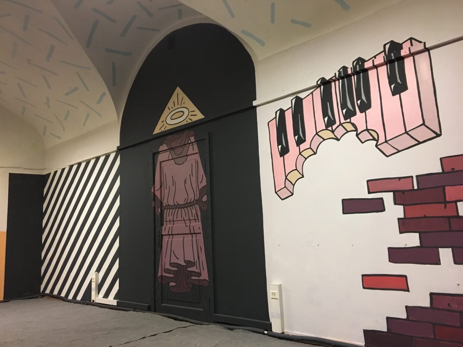 This interior decor project was created inside an old monastery for my friend Adomas, who invited me to paint his band’s rehearsal studio — the space where they play and create music. It’s a spontaneous composition, blending textures, symbols, and a mix of random visual elements.