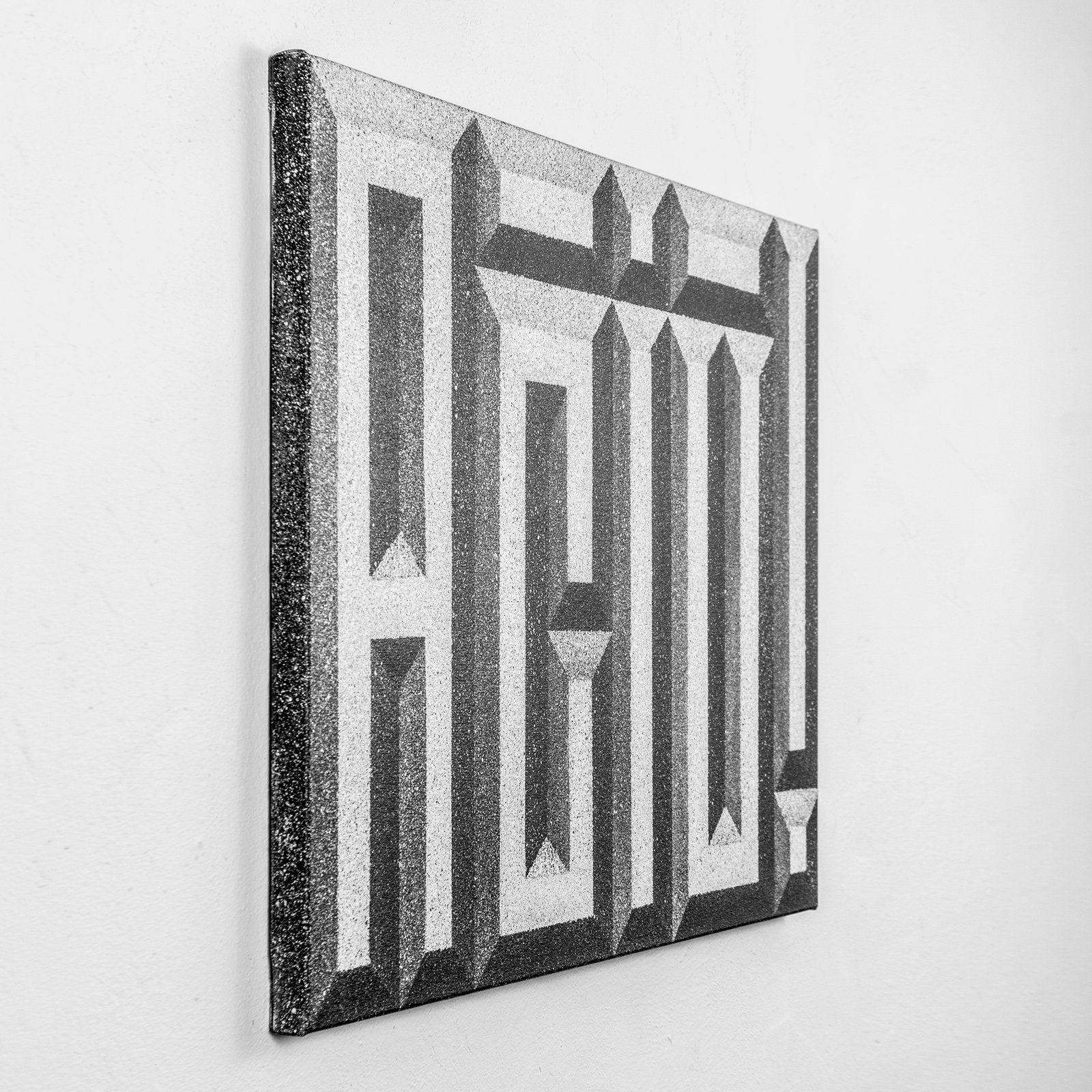 The works in the “Noise” series are created using a special spray-paint technique. Instead of producing a soft mist or smooth shading, the paint breaks into tiny dots, similar to pointillism. This gives the surface a textured, grainy feel—something between stone, old film grain, and digital noise.