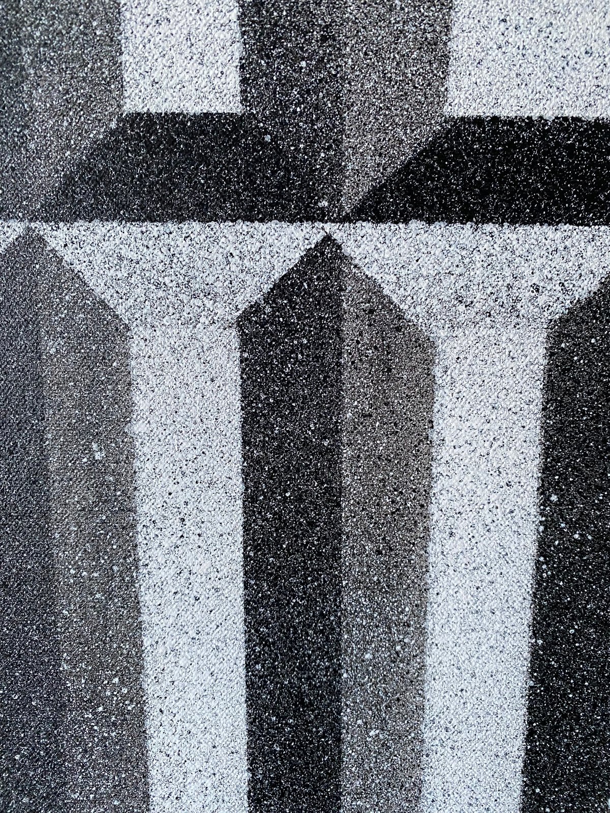 These textured surfaces are combined with clean, geometric shapes that sometimes create an optical-illusion effect. The result is bold, simple, and visually striking. Nothing extra is needed; the contrast between the grainy spray and the sharp graphic forms is enough to carry the whole idea.
