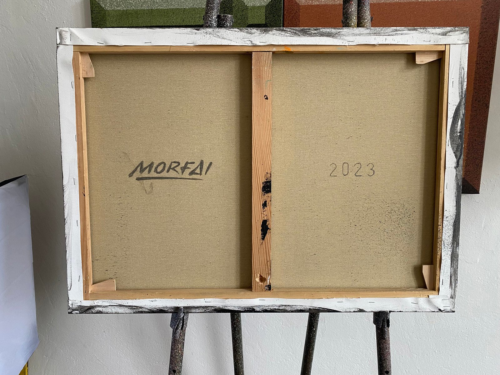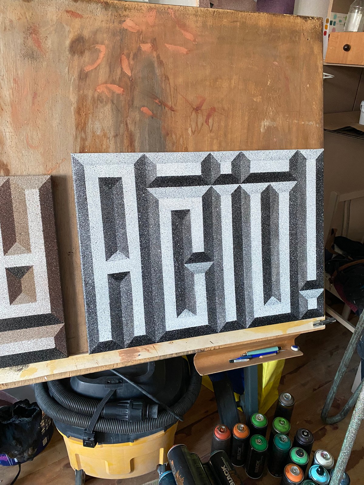 The “Noise” series began from this straightforward approach, and the method offers endless possibilities for creating new works by combining sprayed textures with strong graphic elements.