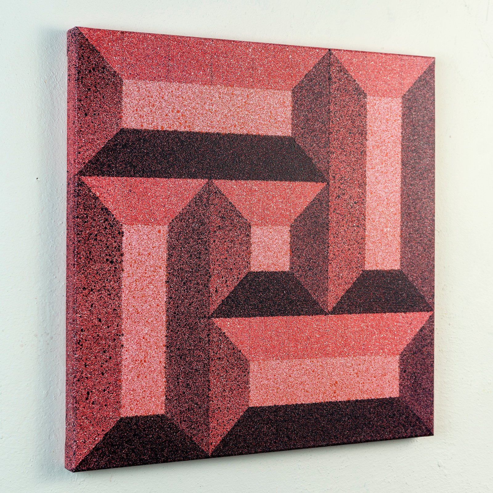 The works in the “Noise” series are created using a special spray-paint technique. Instead of producing a soft mist or smooth shading, the paint breaks into tiny dots, similar to pointillism. This gives the surface a textured, grainy feel—something between stone, old film grain, and digital noise.