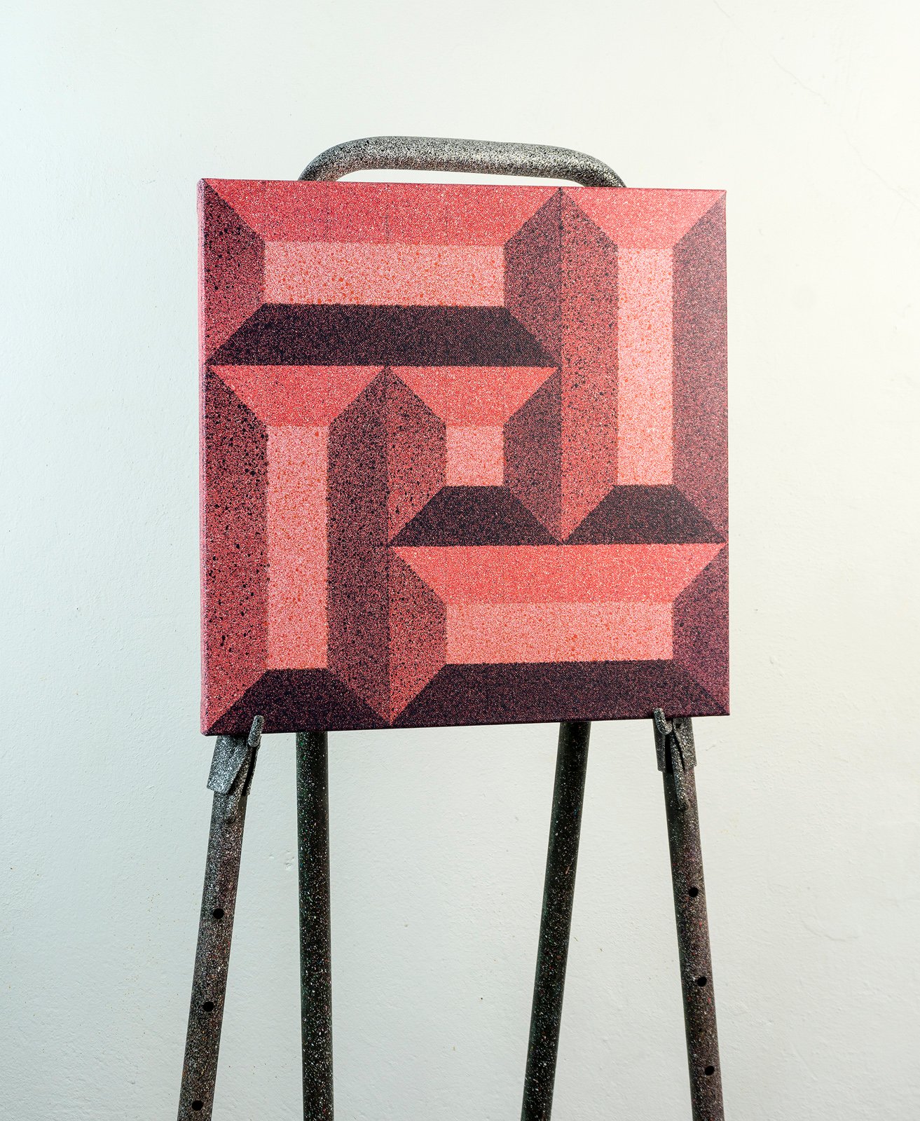 These textured surfaces are combined with clean, geometric shapes that sometimes create an optical-illusion effect. The result is bold, simple, and visually striking. Nothing extra is needed; the contrast between the grainy spray and the sharp graphic forms is enough to carry the whole idea.