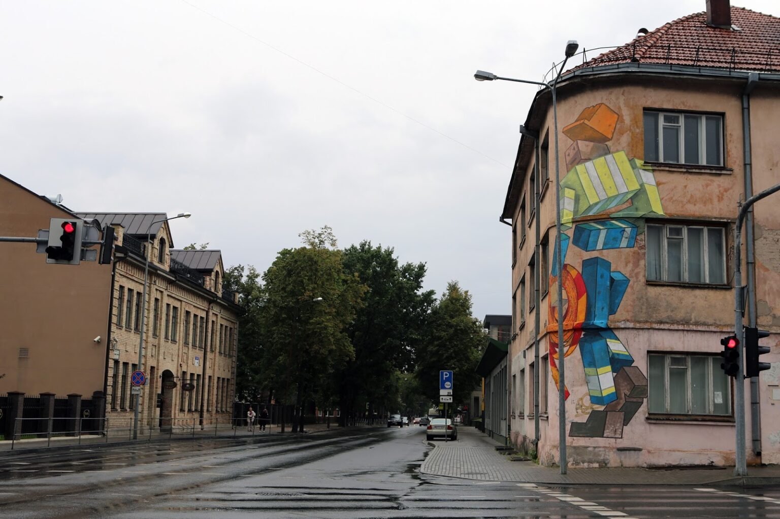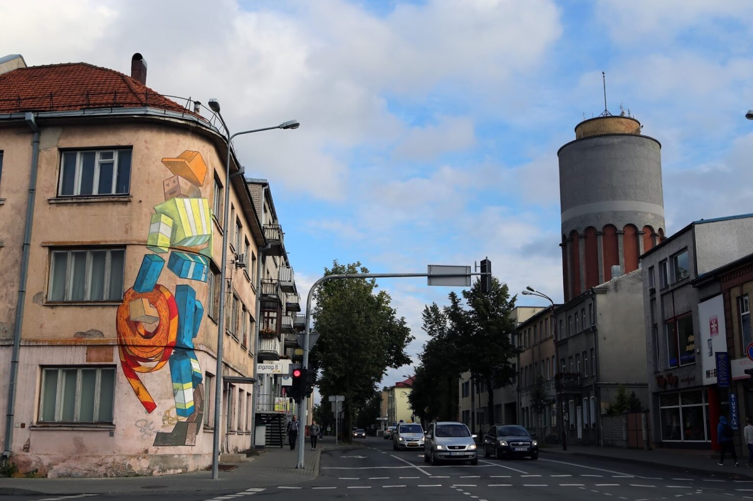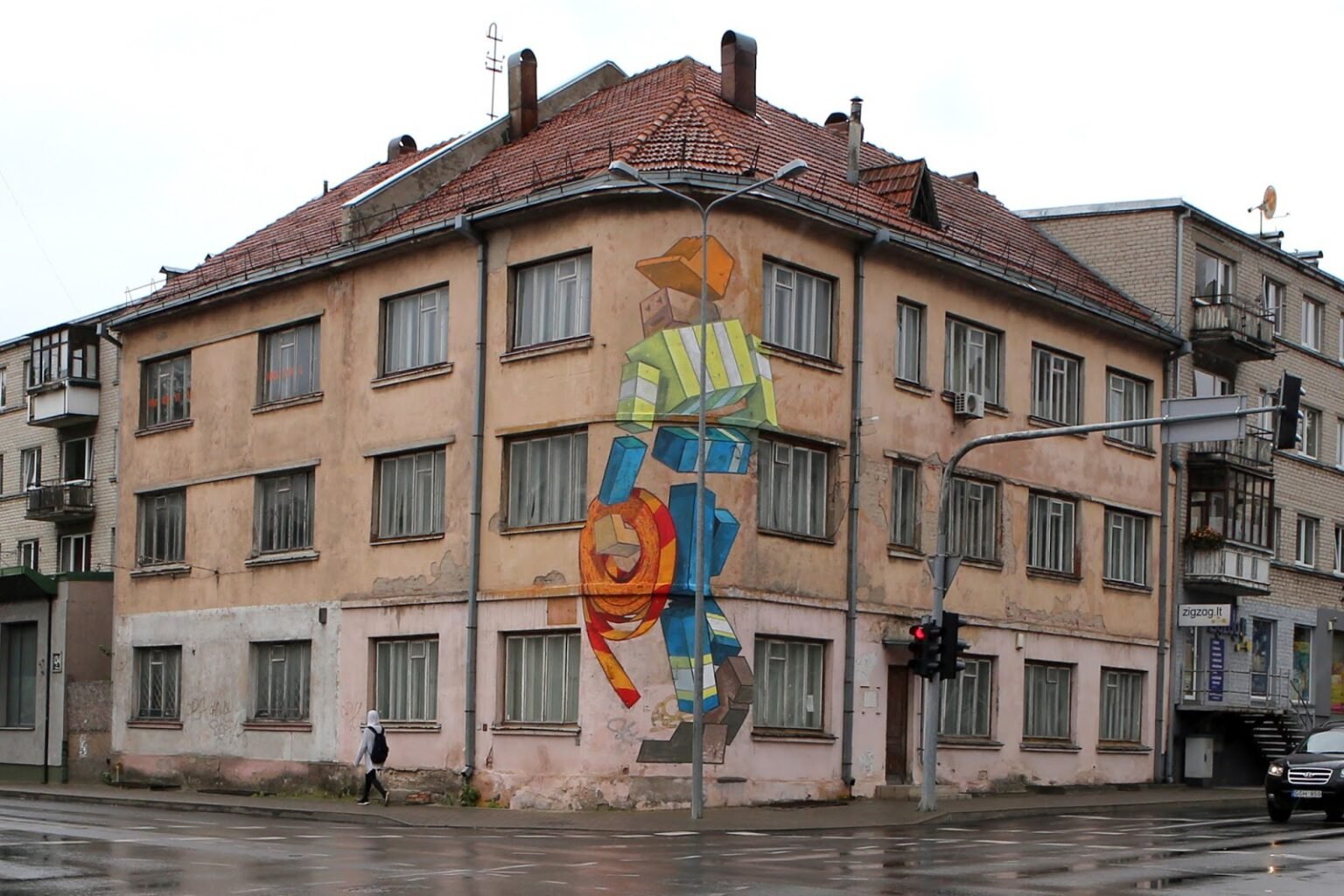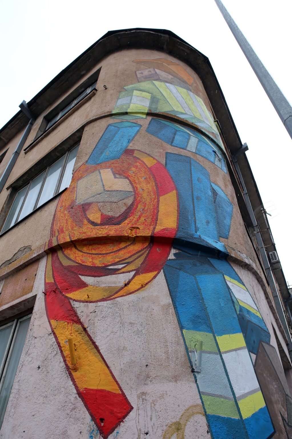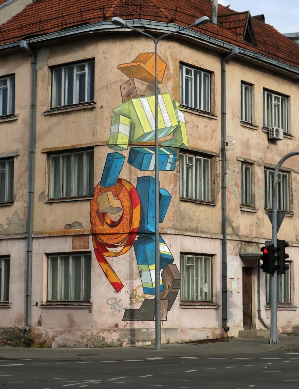 The mural depicts a stylized road worker. I wanted to capture an ordinary person at their everyday work — a figure often seen on the streets, here seemingly carrying a “stop” tape. The corner of the building is rounded, while the figure itself is angular, creating a visual contrast.