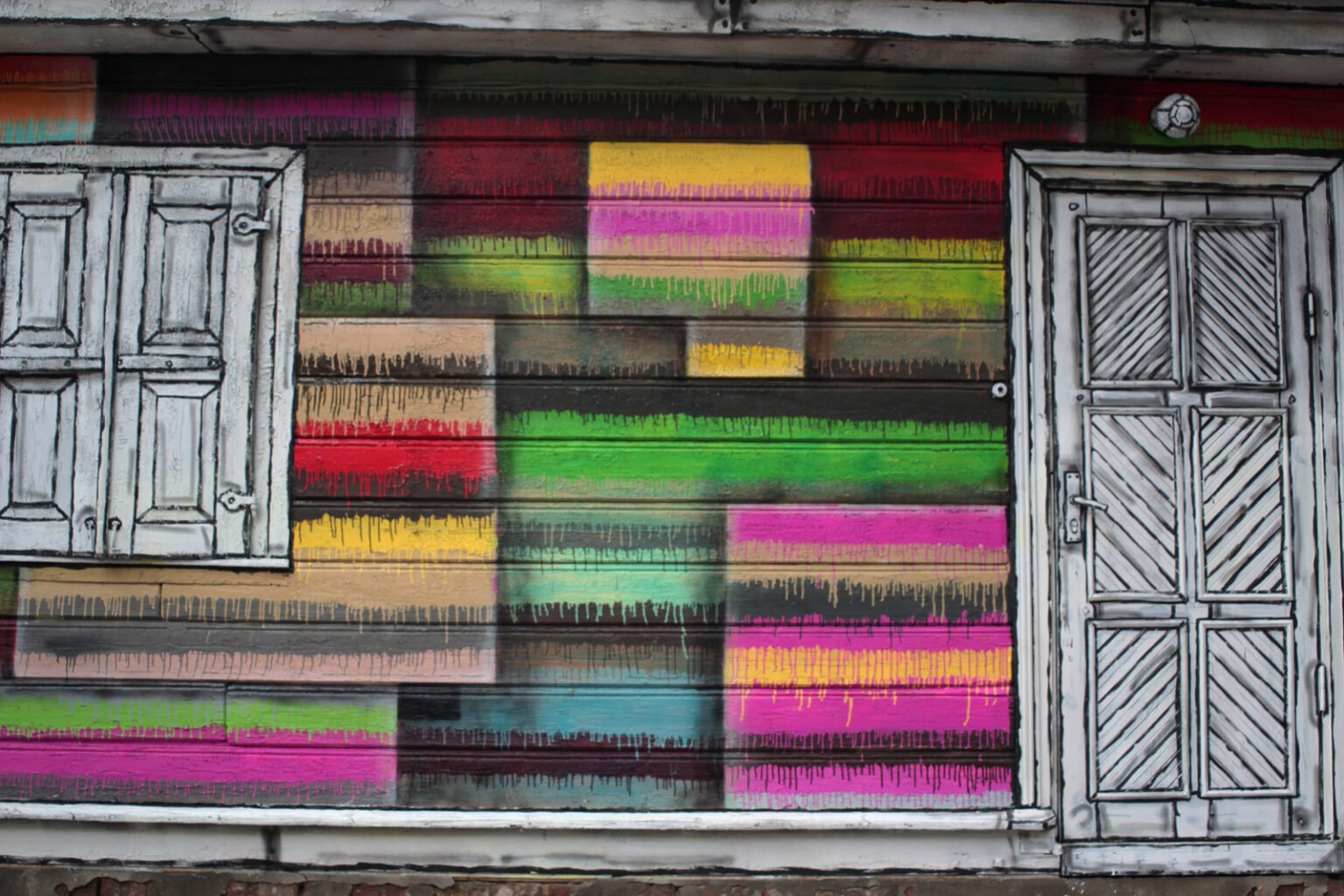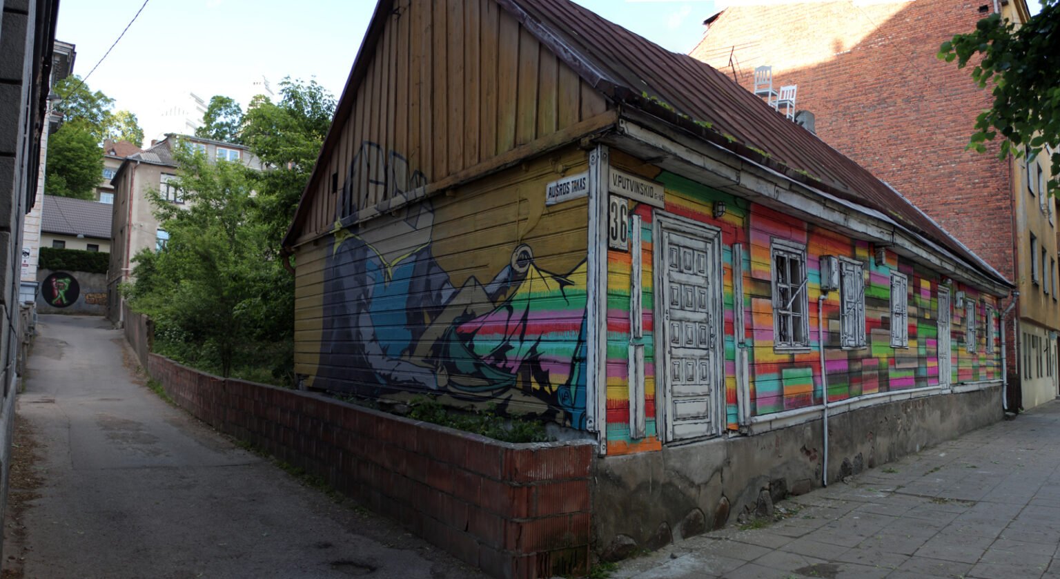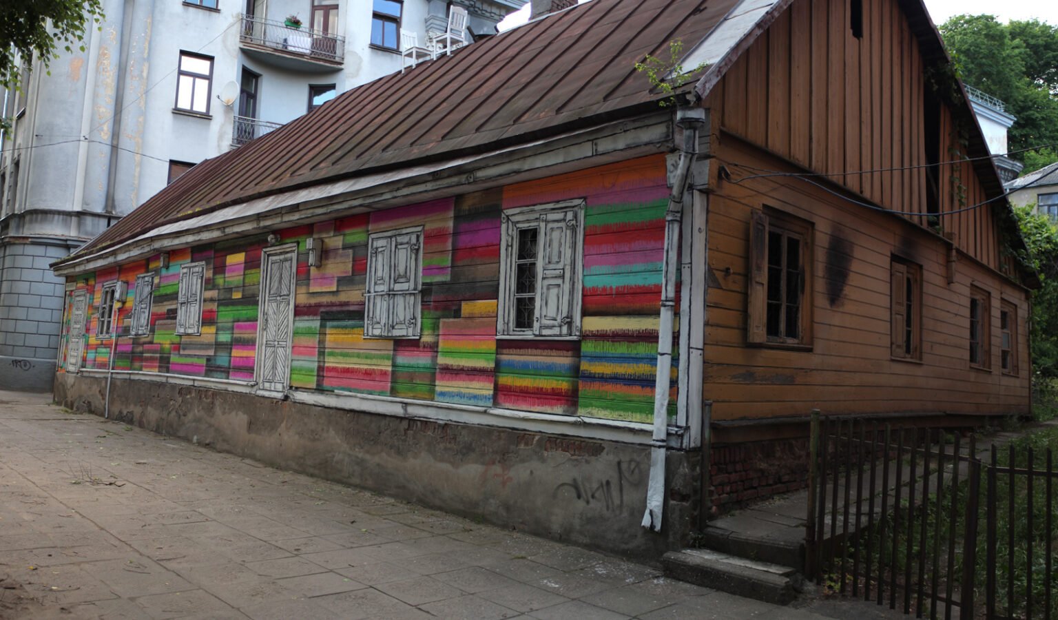 People love color — bright colors instantly lift the mood. That’s the conclusion I came to while working on this wall. Painting this old wooden house was part of the “Putvinskio Street Day” event organized by the Kaunas Artists’ House.