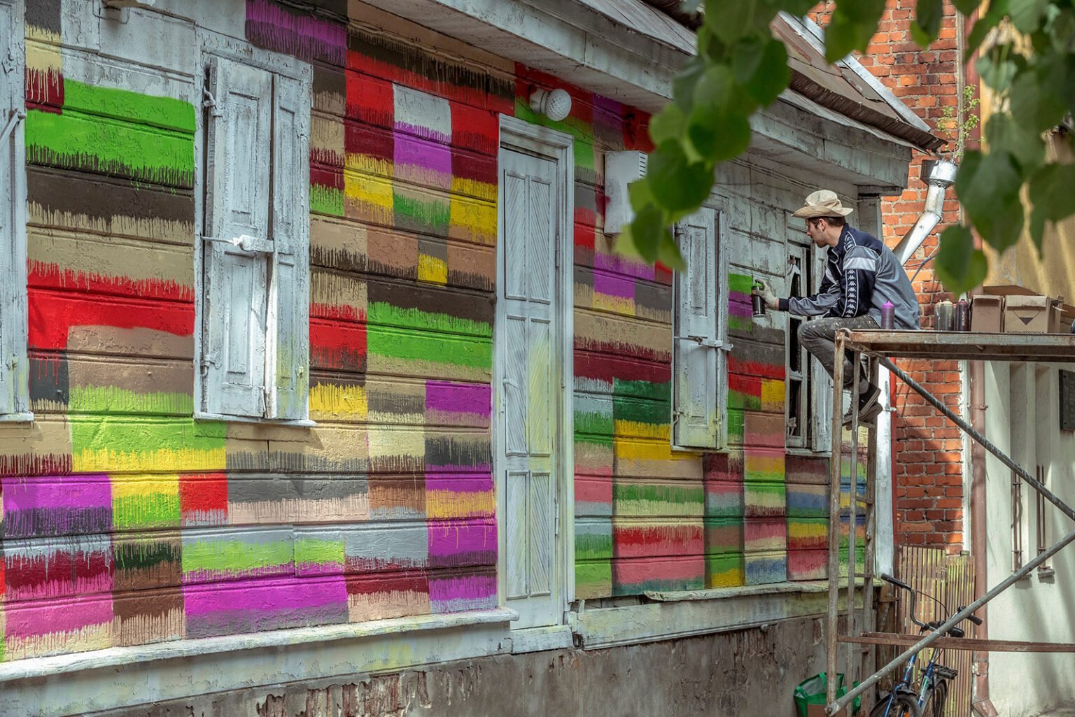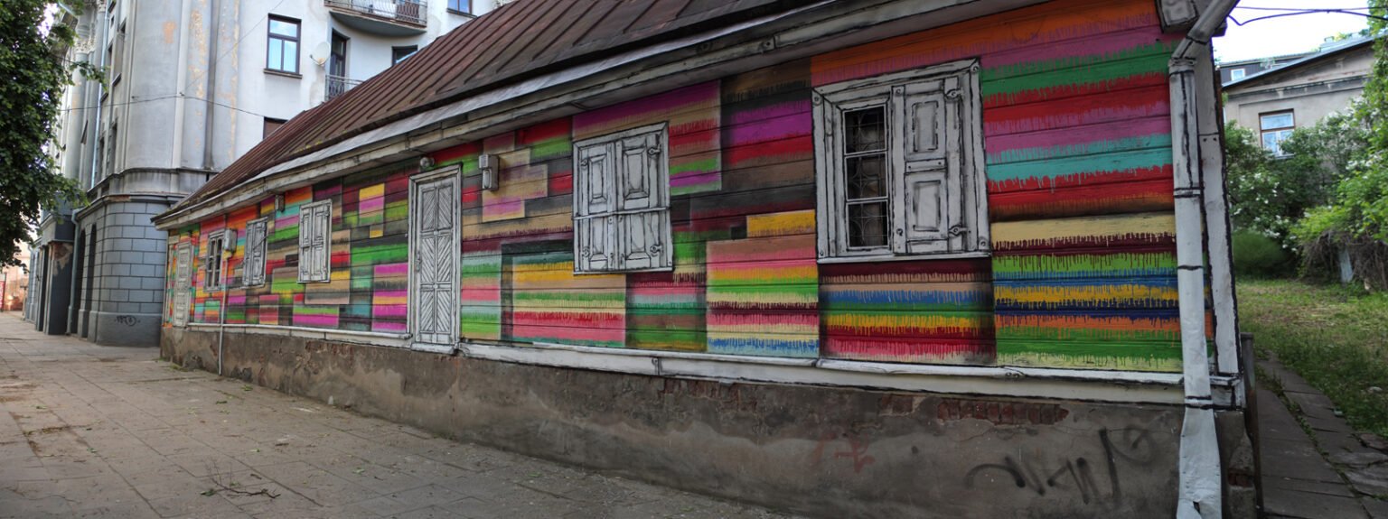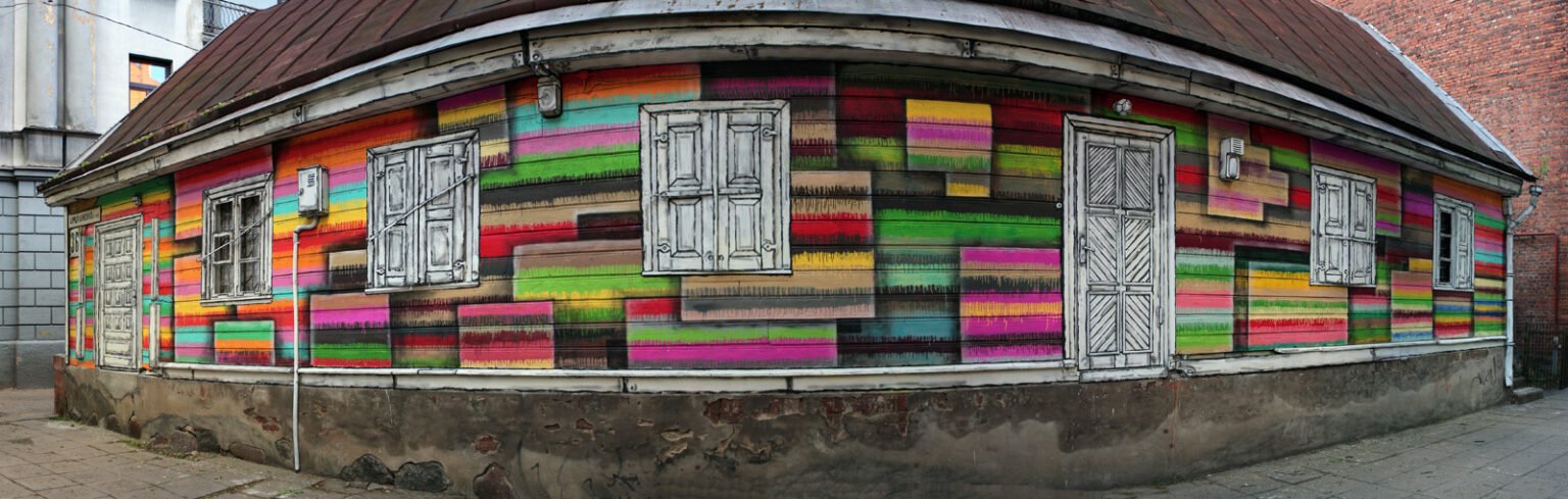 People love color — bright colors instantly lift the mood. That’s the conclusion I came to while working on this wall. Painting this old wooden house was part of the “Putvinskio Street Day” event organized by the Kaunas Artists’ House.