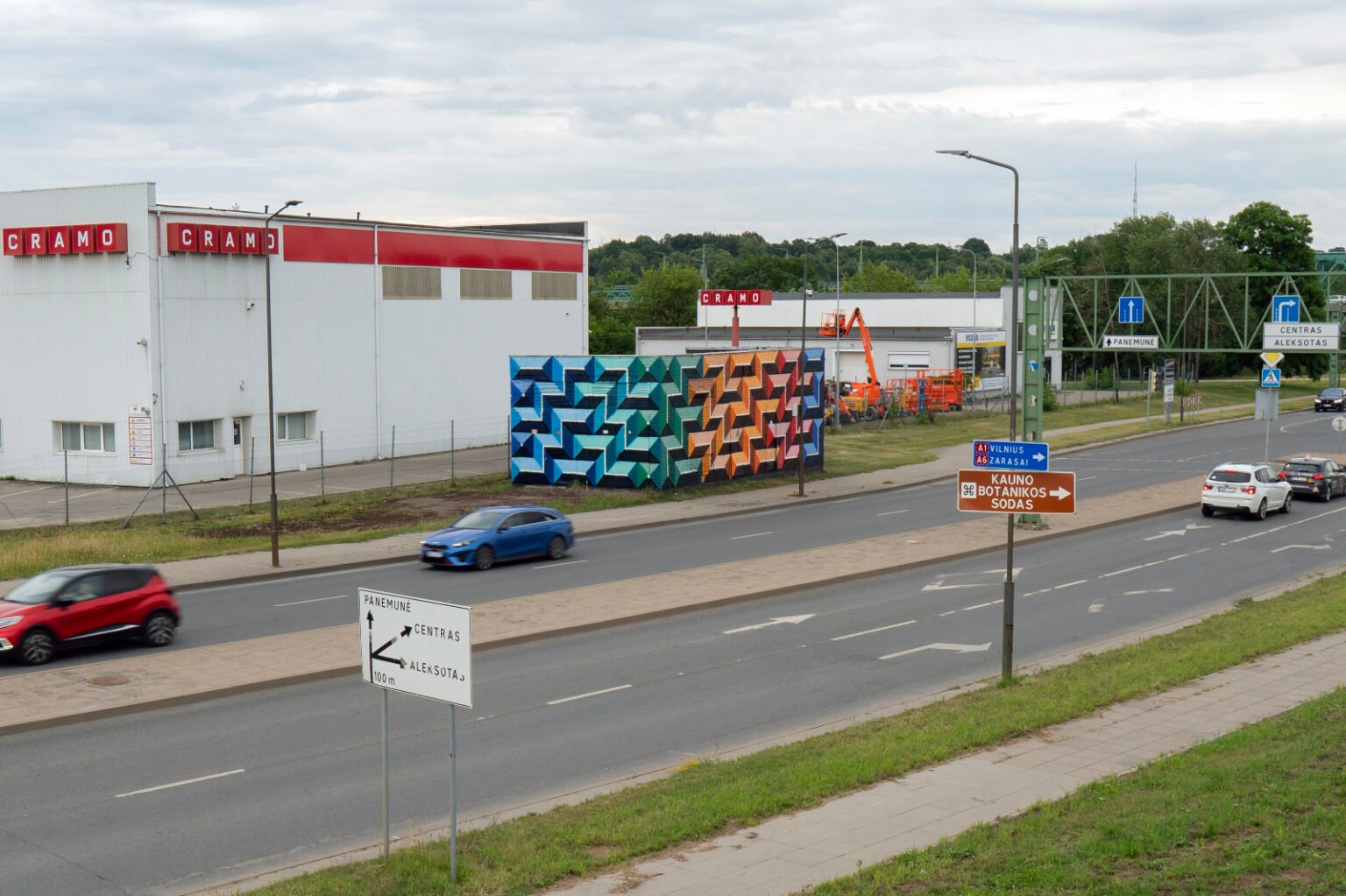 The composition, inspired by traditional Baltic patterns, symbolizes water waves and the flow of the river. The water symbol – the zigzag – connects both to the flow of car traffic on one side and to the nearby Nemunas River on the other.