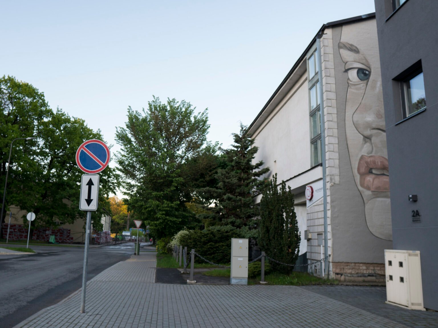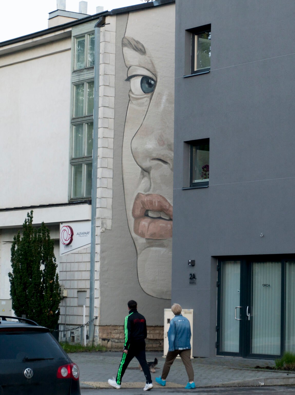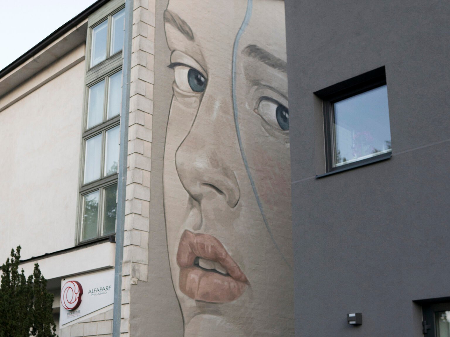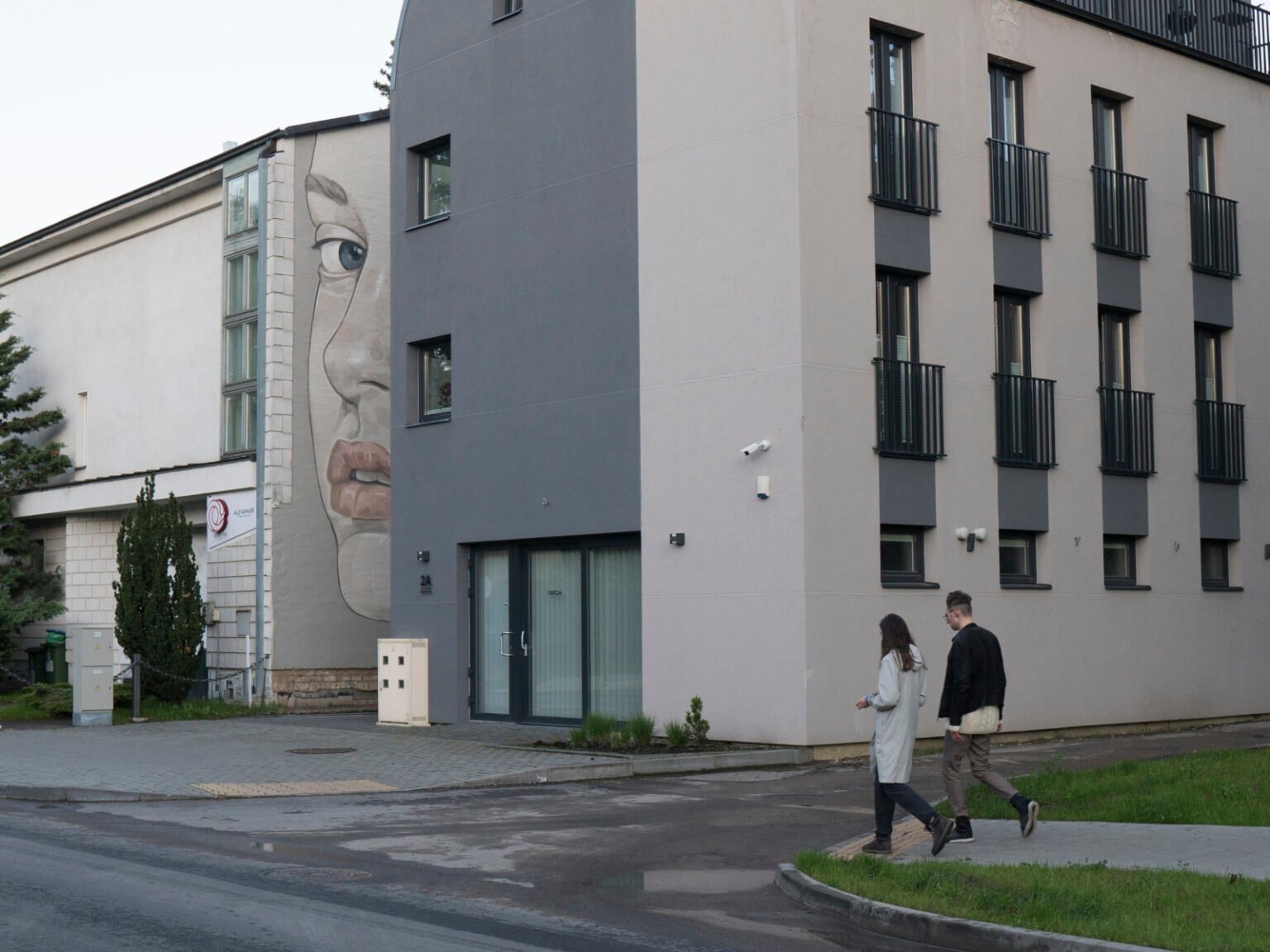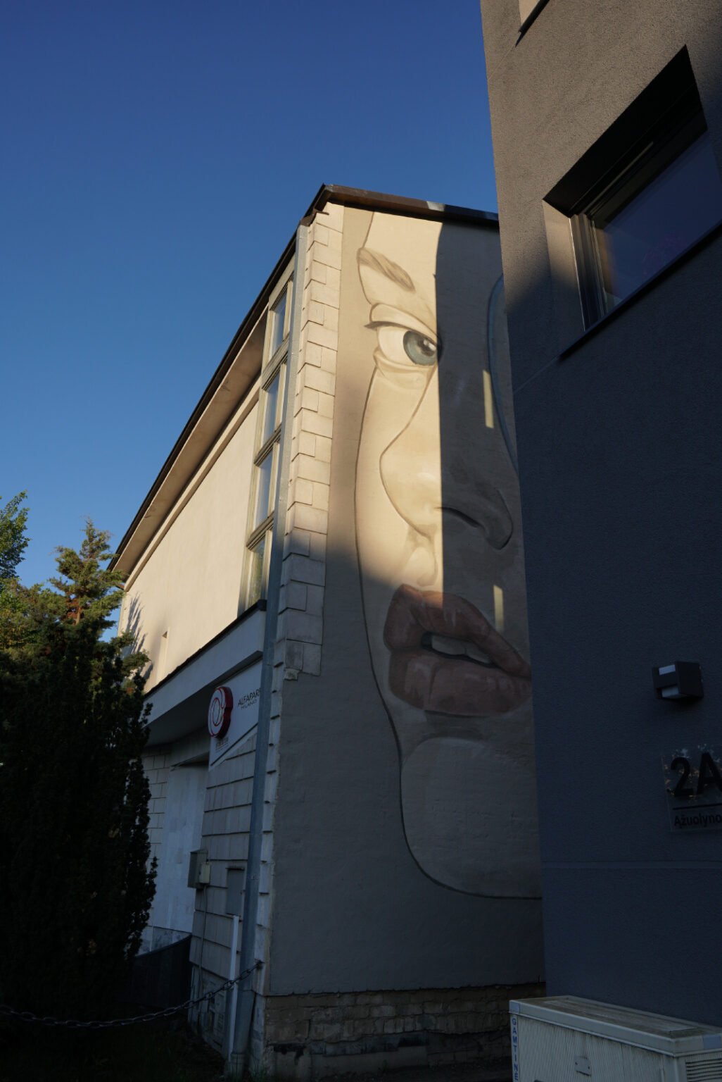 A mysterious female face gazes from the narrow gap between two neighboring buildings — her calm yet piercing eyes meeting the flow of people heading toward Ąžuolynas Park. What was once a plain brick wall was transformed into a striking visual landmark, bringing character and a quiet sense of emotion to the neighborhood.