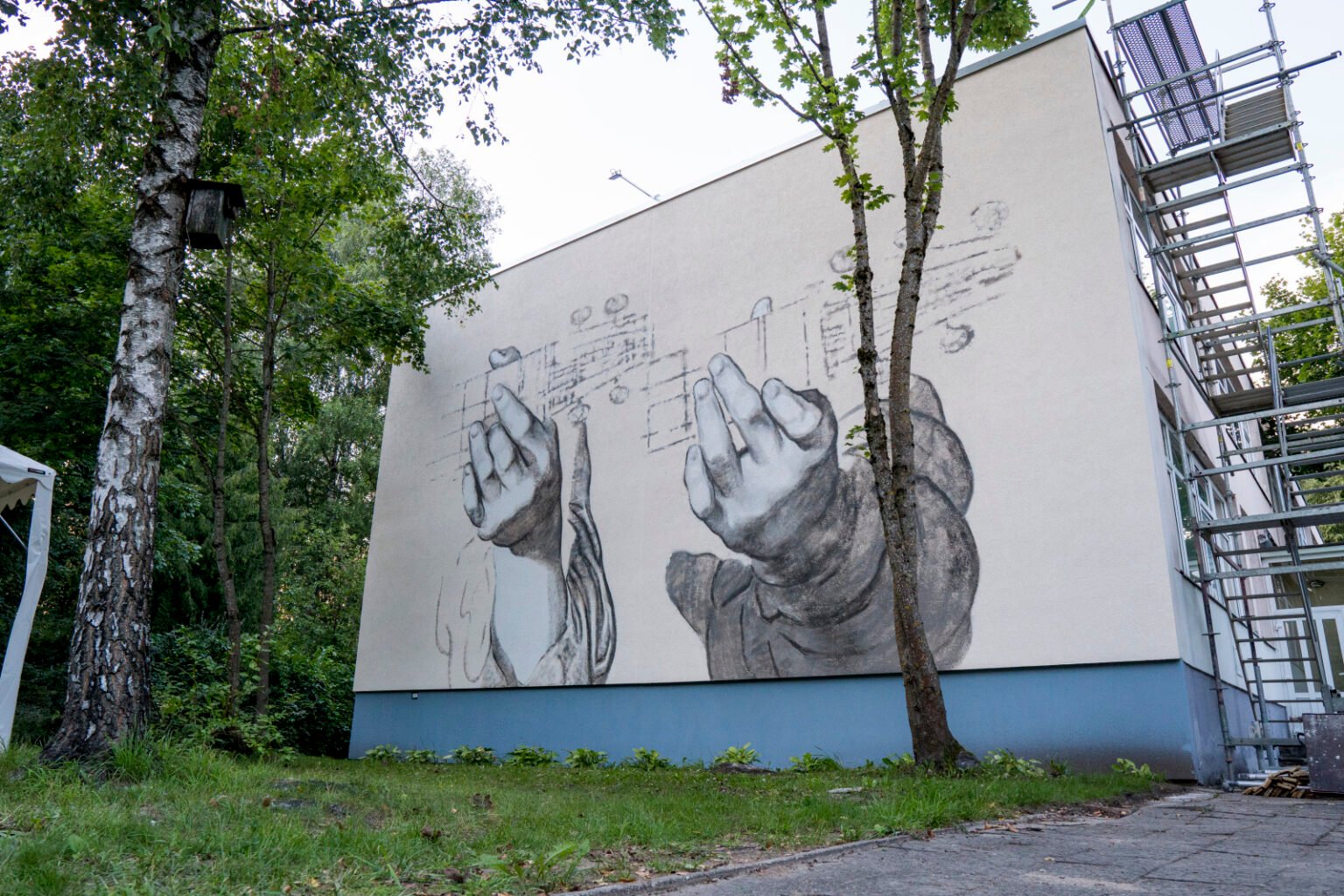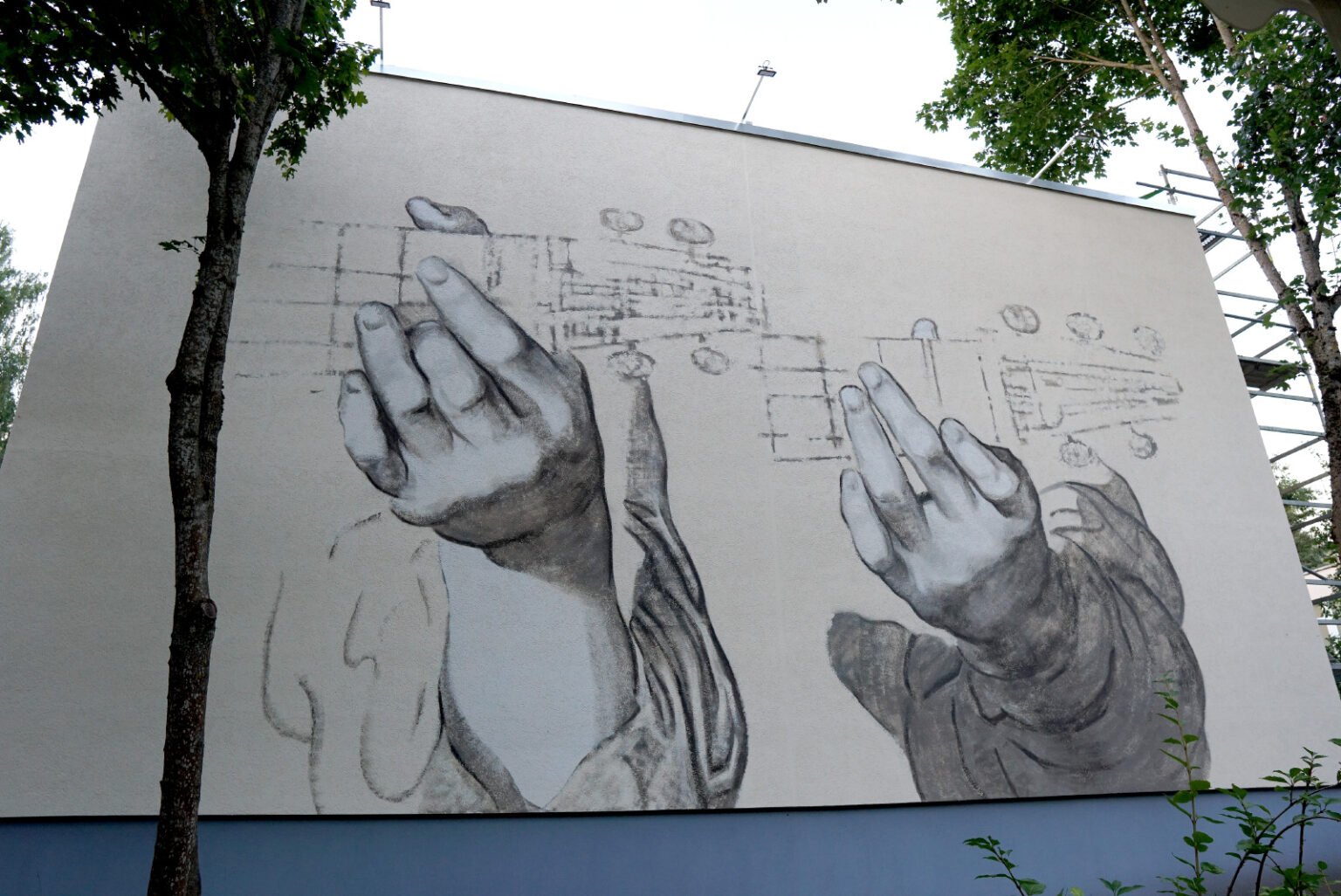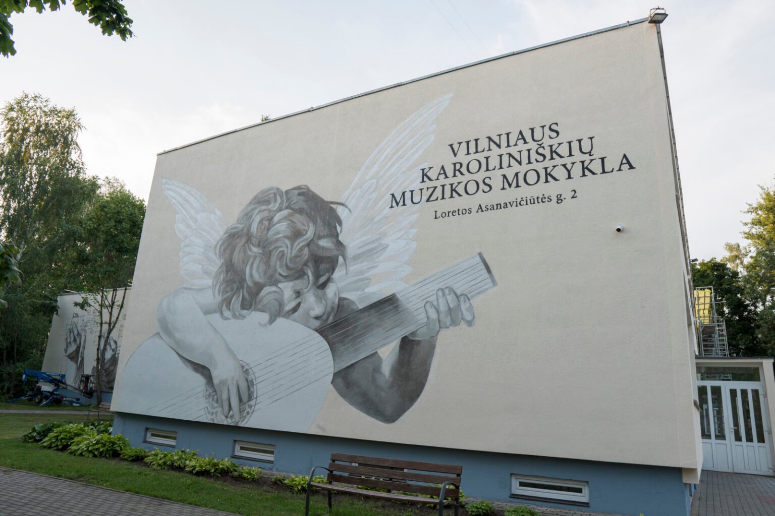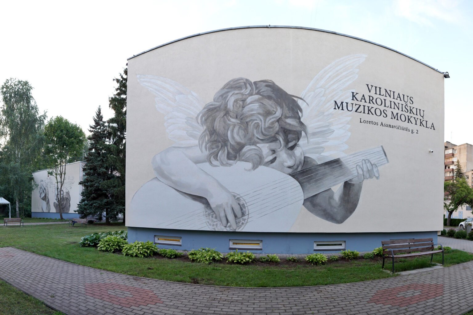 Private commission by the Vilnius Karoliniškės Music School to decorate two of their building facades. The main idea was to introduce a classical touch, so I chose to repaint Rosso Fiorentino’s Angel Playing the Lute on one wall. On the other, a pair of hands forming guitar chords — also inspired by a Renaissance-era drawing — was reproduced. A subtle nod to classical art felt like a perfect complement for a school dedicated to music.